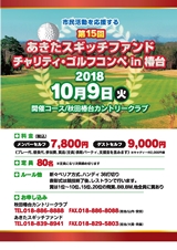 下の画像をクリックするとチラシをご覧できます 日時 :平成30年10月9日(火) 会場 :秋田椿台カントリークラブ 料金 :メンバー 9,800円(キャディ付) 7,800円(セルフ) ビジター 11,000円(キャディ付) 9,000円(セルフ) ≪プレー代、昼食代、賞品、表彰パーティ、支援金を含みます≫ 定員 :80名 ※定員になり次第締め切ります